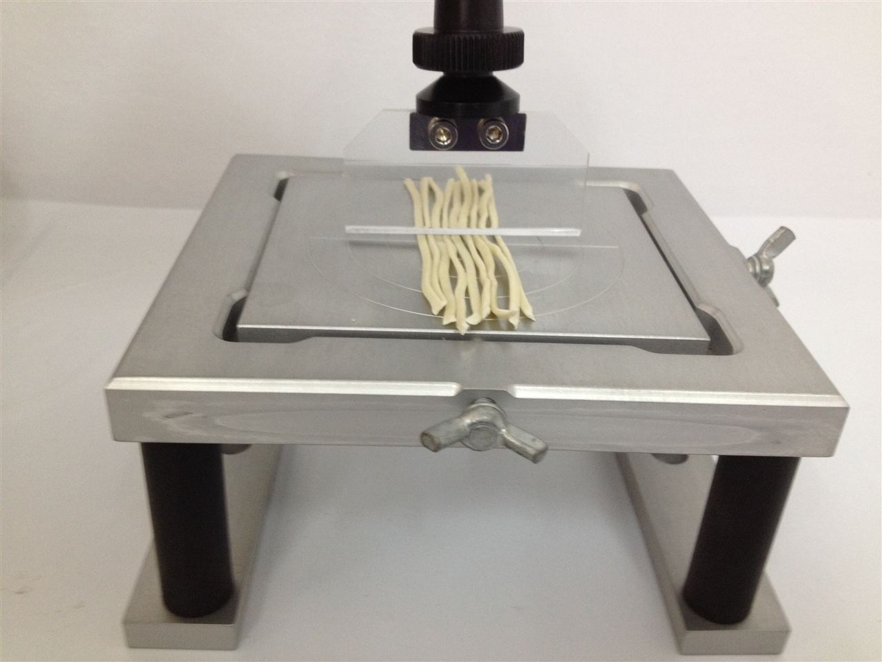 在拉伸模式下,将面条缠绕于两根探测棒上对其进行拉伸,直到拉断为止,记录面条的zui大拉断力及拉伸距离。目前zui常用的拉伸探头有A/KIE 和A/SPR。面条的蒸煮时间、煮后面条的放置时间对质构测定有较大影响,应尽量保持各样品的一致性,以便得出更可靠的结论。