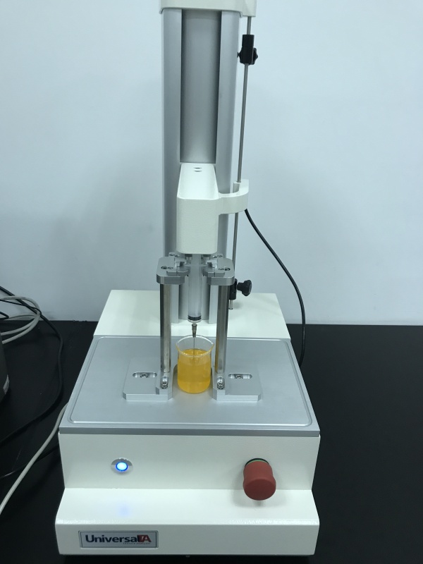 注射药液的通针性主要以注射器将溶液推出注射针头所需的力。Universal TA质构仪广泛应用于医药行业,可测试锭剂、丸剂、胶囊剂、膏剂、栓剂、膜剂海绵剂、喷雾剂、医用辅料、吸收剂、稀释剂、胶粘剂、糖浆、乳糖、医用胶带、注射针头、注射器、移用绷带、膜材料、骨骼替代材料、医用包装材料等。在测试溶液通针性方面,我们有设计专门的通针性测试装置。