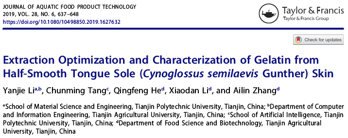 2019年6月24日,食品期刊《Journal of Aquatic Food Product Technology》在线发表了天津工业大学材料科学与工程学院研究团队题为“Extraction Optimization and Characterization of Gelatin from Half-Smooth Tongue Sole (Cynoglossus semilaevis Gunther) Skin”的研究论文。