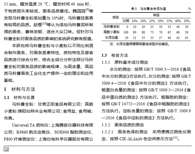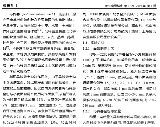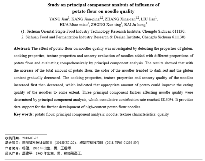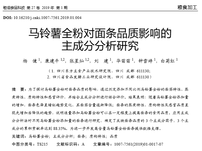 2019年,四川东方主食产业技术研究院研究人员在国内食品期刊《粮食食品科技》在线发表了题为“马铃薯全粉对面条品质影响的主成分分析研究”的研究论文。在该论文中,研究人员使用上海腾拔Universal TA质构仪测定面条硬度、弹性、回复性、咀嚼性、粘性和拉伸特性等指标。