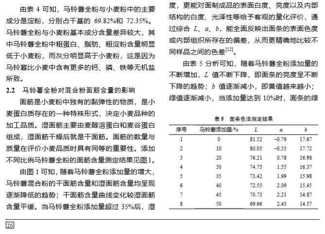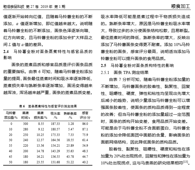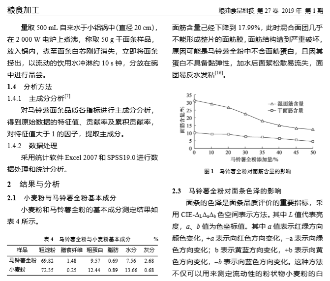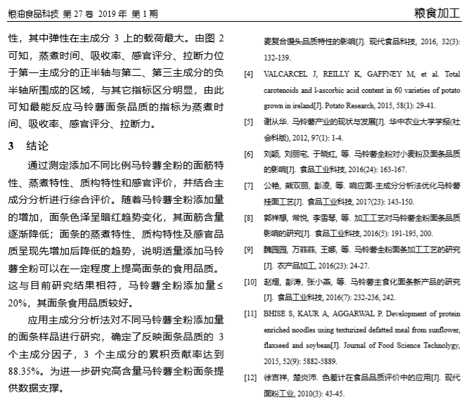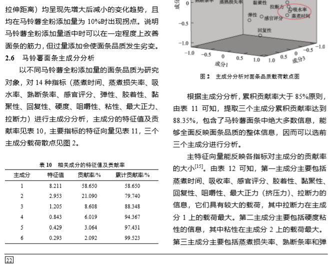 摘 要: 为了探讨马铃薯全粉对面条品质的影响,通过测定添加不同比例马铃薯全粉的面筋特性、蒸煮特性、质构特性和感官评价,并结合主成分分析进行综合评价。结果表明:随着马铃薯全粉添加量的增加,面条色泽呈暗红趋势变化,其面筋含量逐渐降低;面条的蒸煮特性、质构特性及感官品质呈现先增加后降低的趋势,说明适量添加马铃薯全粉可以在一定程度上提高面条的食用品质。应用主成分分析法对不同马铃薯全粉添加量的面条进行研究,确定了反映面条品质的3个主成分因子,3个主成分的累积贡献率达到88.35%。