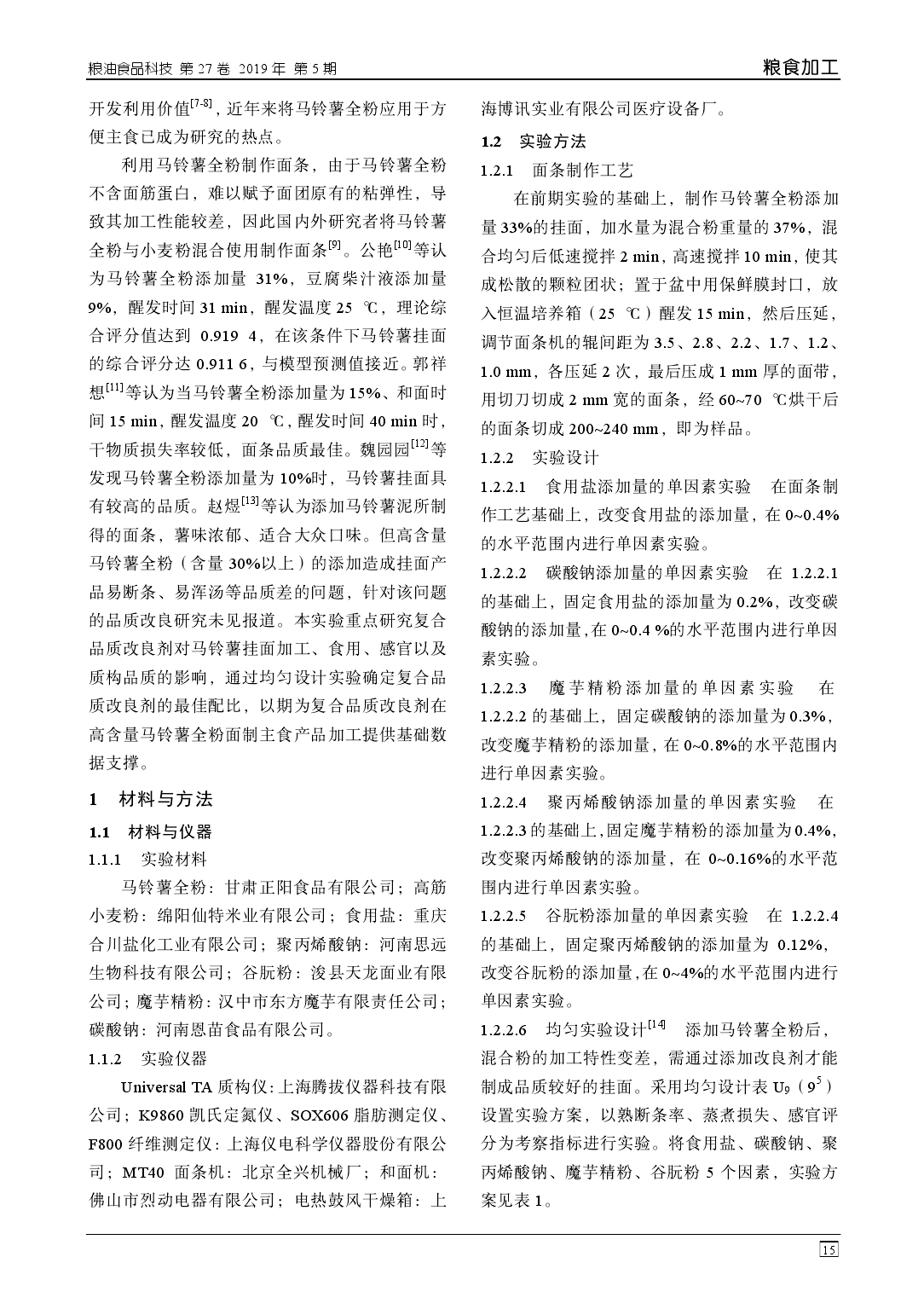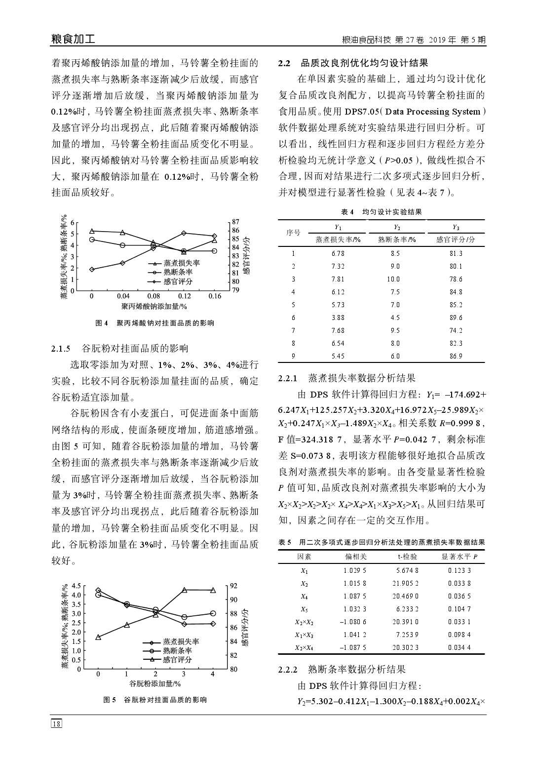 摘 要:利用均匀设计优化高含量马铃薯(全粉含量 33%)挂面的品质改良,通过回归分析确定其品 质的主要影响因素,以熟断条率、蒸煮损失、感官评分为考察指标进行实验。结果表明:品质改良剂 为食用盐 0.31%,碳酸钠 0.12%,魔芋精粉 0.34%,谷朊粉 2.80%,聚丙烯酸钠 0.11%时,得到的挂面 蒸煮损失率为 3.73%,熟断条率为 3.0%,感官评分 91.5 分。通过对品质改良剂的研究,解决了高含量 马铃薯挂面易断条、易浑汤等技术难题,使样品品质明显优于市售挂面。