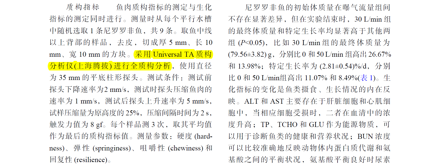 2020年,国内期刊《水产学报》在线发表了华南理工大学土木与交通学院、中国水产科学研究院珠江水产研究所等研究人员题为"室内循环养殖系统中曝气流量对尼罗罗非鱼生长的影响"的研究论文。在该论文中,研究人员用上海腾拔仪器科技有限公司的Universal TA国产质构仪测定罗非鱼肉的硬度、弹性、咀嚼性和回复性等质构指标。