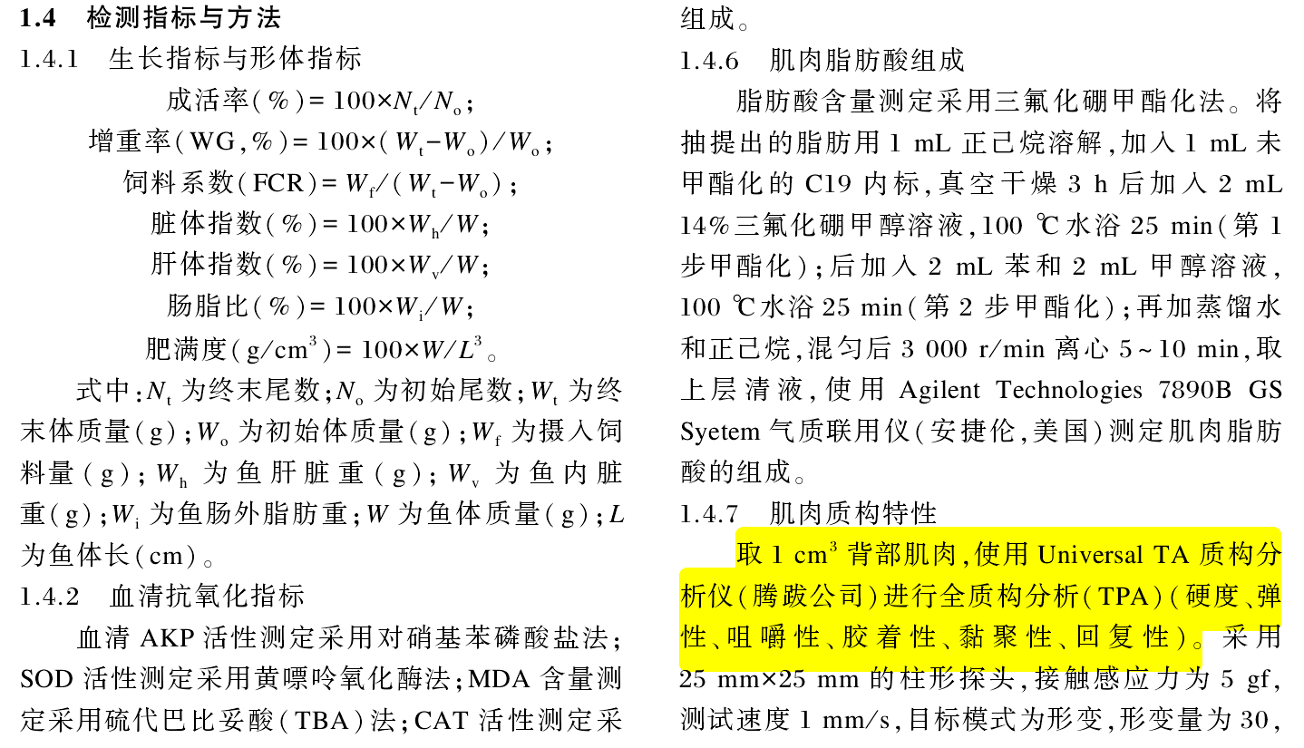 2020年,国内期刊《动物营养学报》在线发表了上海海洋大学研究人员题为"儿茶素对草鱼生长性能、血清抗氧化指标和肌肉品质的影响"的研究论文。在该论文中,研究人员用上海腾拔仪器科技有限公司的Universal TA国产质构仪测定草鱼肌肉的硬度、弹性、咀嚼性、内聚性和回复性等质构特性。