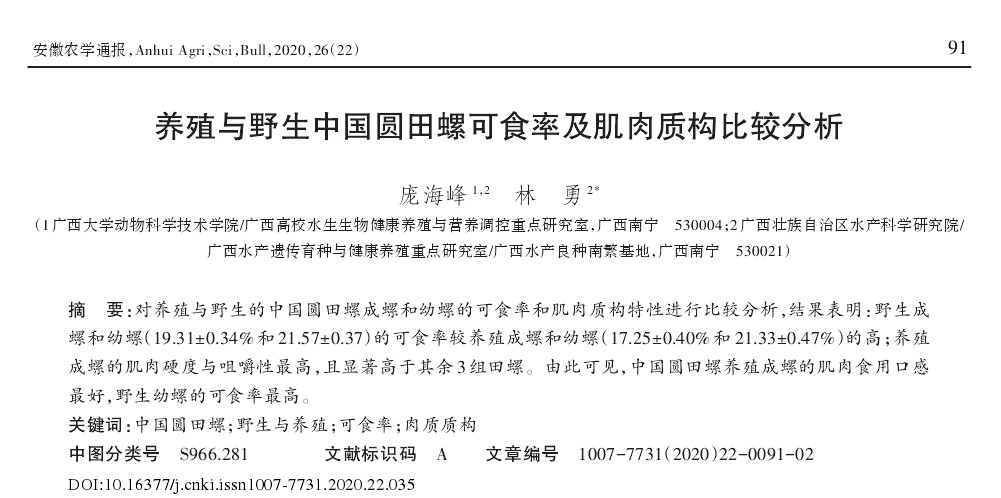 2020年,广西壮族自治区水产科学研究院和广西大学动物科学技术学院研究人员在国内期刊《安徽农学通报》在线发表了题为“养殖与野生中国圆田螺可食率及肌肉质构比较分析"的研究文章。在该论文中,研究人员使用上海腾拔仪器科技有限公司的Universal TA质构仪来测定田螺肌肉的硬度、弹性、回复性、内聚性和咀嚼性指标。