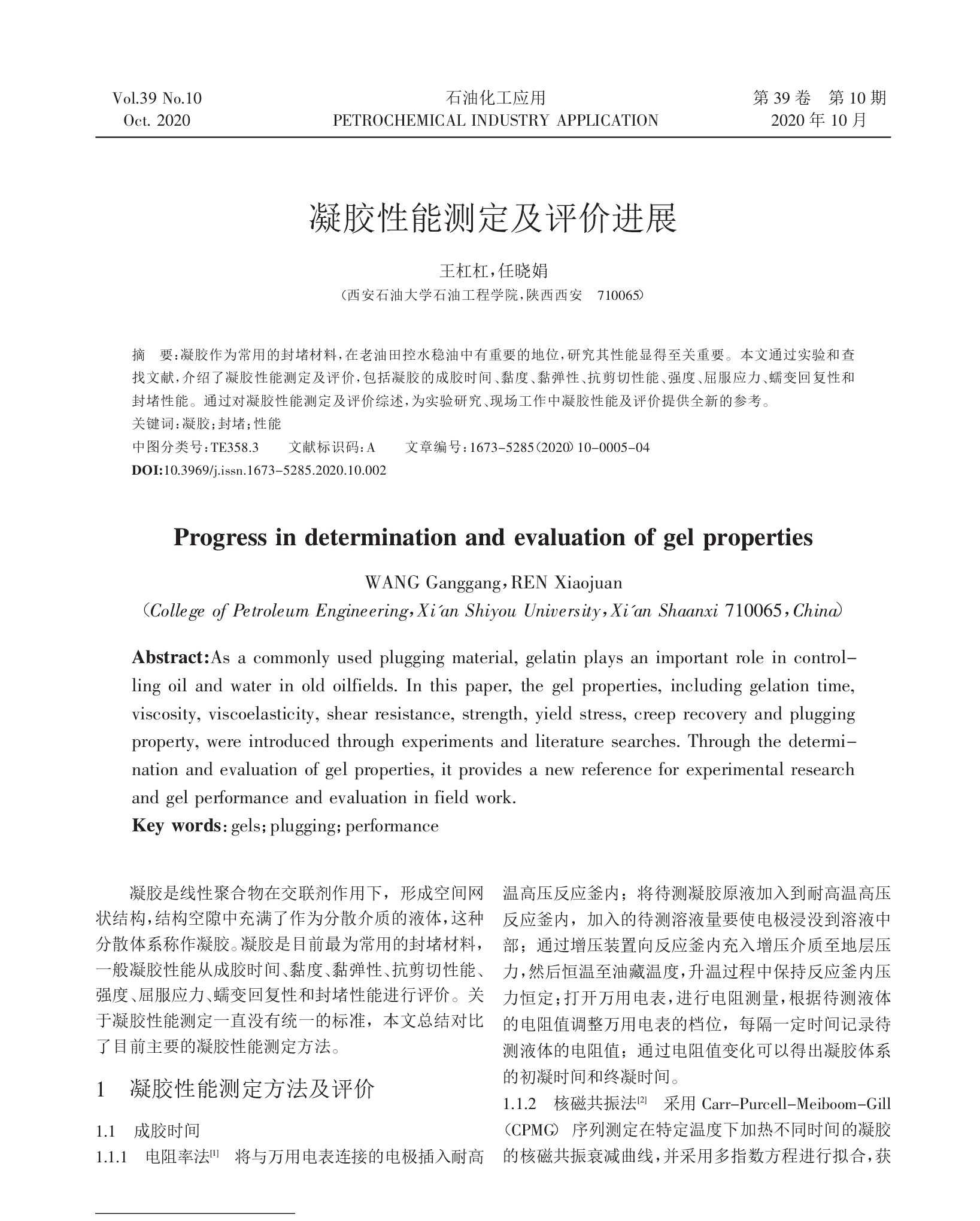 凝胶是线性聚合物在交联剂作用下,形成空间网状结构,结构空隙中充满了作为分散介质的液体,这种分散体系称作凝胶。凝胶是目前常用的封堵材料,一般凝胶性能从成胶时间、黏度、黏弹性、抗剪切性能、强度、屈服应力、蠕变回复性和封堵性能进行评价。关于凝胶性能测定一直没有统一的标准,本文总结对比了目前主要的凝胶性能测定方法。