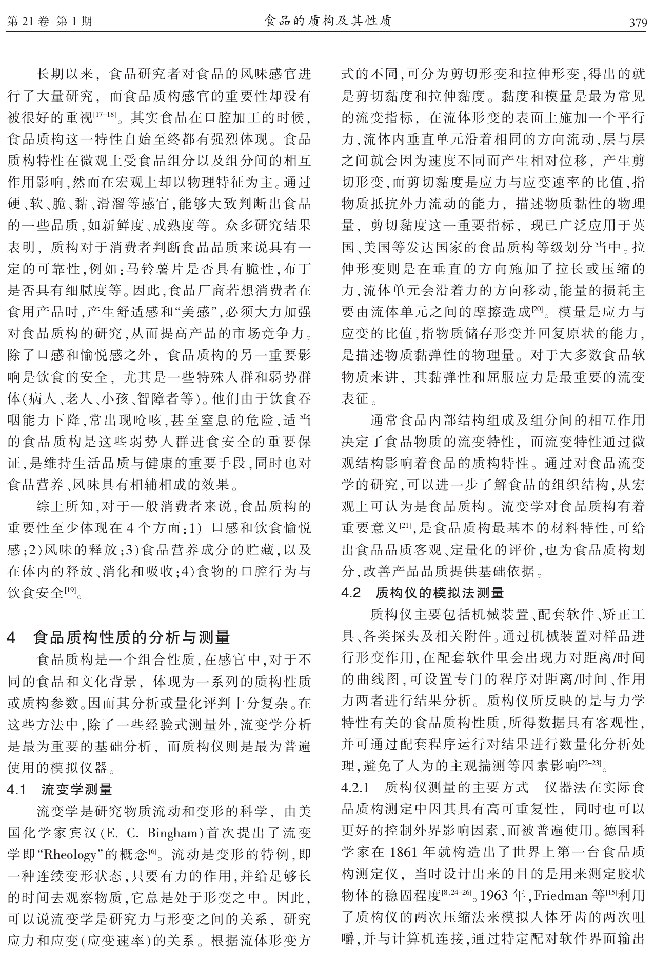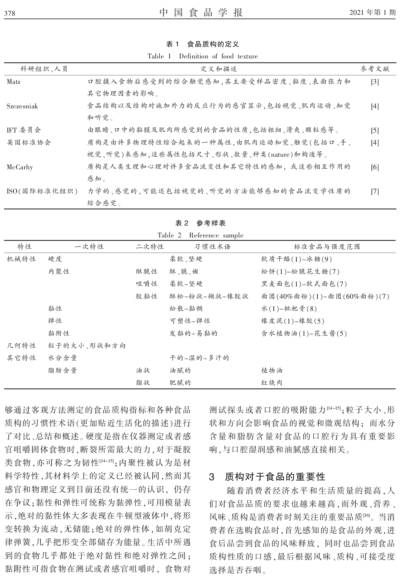 食品质构是食品材料与结构性质的感官体现,直接影响食品的口腔行为、风味释放和感官愉悦,是影响消费者对食品的喜好和可接受性的重要因素。本文阐述食品质构的定义、质构性质的分类、感知途径和仪器测量方法等,以期让科研人员更好地理解食品质构及其性质,推动该领域研究的发展,为食品工业设计开发营养可口的高质量食品提供理论依据。