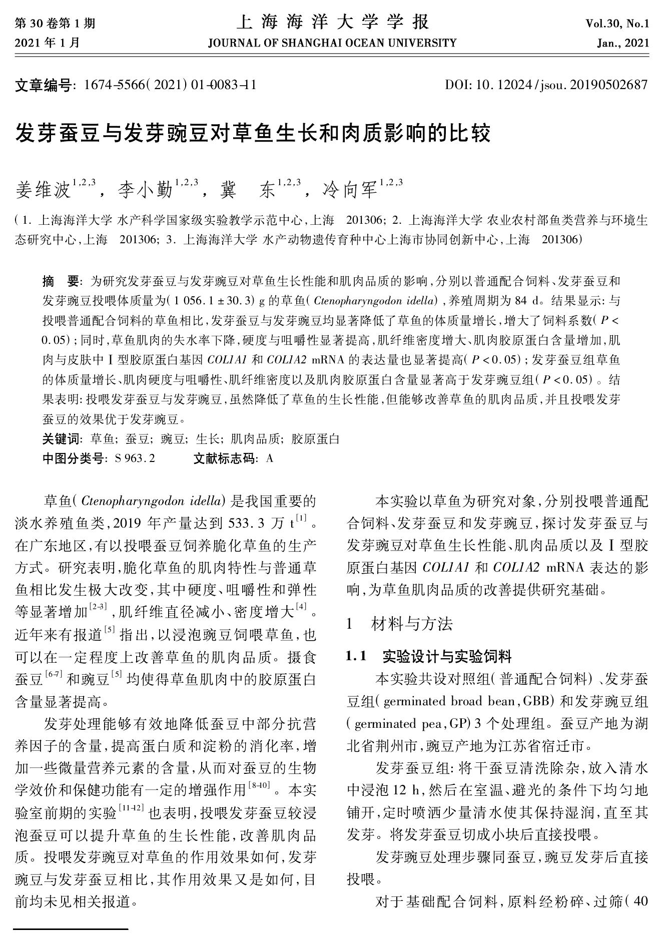 摘要:为研究发芽蚕豆与发芽豌豆对草鱼生长性能和肌肉品质的影响,分别以普通配合饲料、发芽蚕豆和发芽豌豆投喂体质量为(1056.1±30.3)g 的草鱼(Ctenopharyngodon idellus),养殖周期84d。结果显示:与投喂普通配合饲料的草鱼相比,发芽蚕豆与发芽豌豆均显著降低了草鱼的增重,增大了饲料系数(P<0.05);同时,草鱼肌肉的失水率下降,硬度与咀嚼性显著提高,肌纤维密度增大、肌肉胶原蛋白含量增加,肌肉与皮肤中Ⅰ型胶原蛋白基因COL1A1 和COL1A2 mRNA 的表达量也显著提高(P<0.05);其中,发芽蚕豆组草鱼的增重、肌肉硬度与咀嚼性、肌纤维密度以及肌肉胶原蛋白含量显著高于发芽豌豆组(P<0.05)。结果表明:投喂发芽蚕豆与发芽豌豆,虽然降低了草鱼的生长性能,但能够改善草鱼的肌肉品质,并且投喂发芽蚕豆的效果优于发芽豌豆。