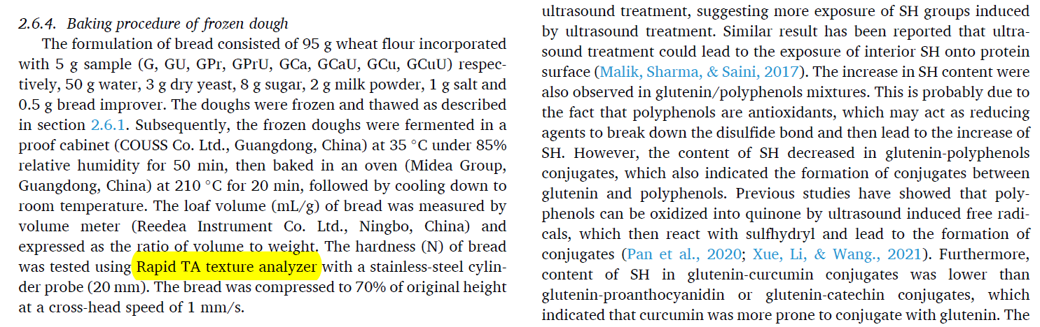近期,南京中医药大学药学院和南京工业大学食品与轻工学院研究人员在国际食品期刊《LWT - Food Science and Technology》发表了题为"Prevention of frozen-dough from deterioration with incorporation of glutenin-polyphenols conjugates prepared by ultrasound"的研究论文。在该研究论文中,研究人员利用上海腾拔Rapid TA质构仪测定冷冻面团面包的硬度。