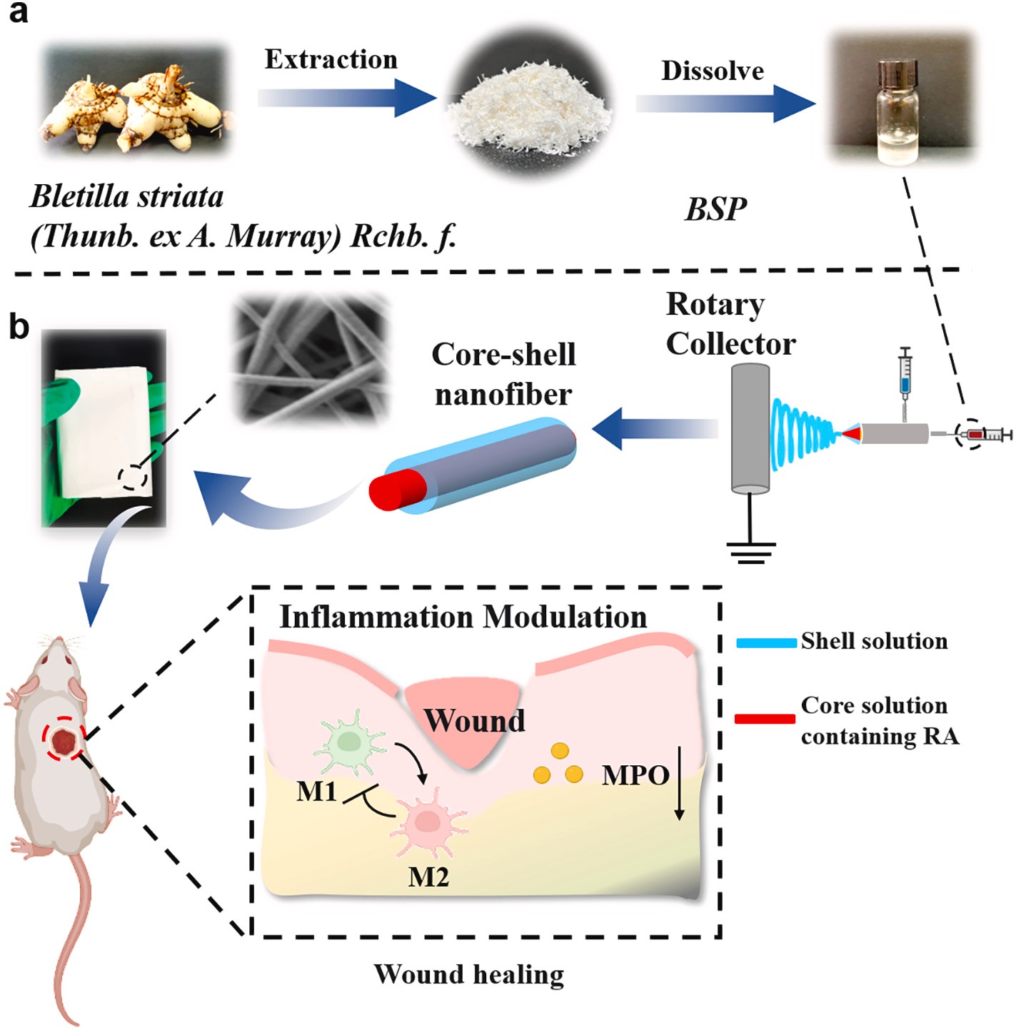 天然植物多糖-白芨多糖(BSP)和迷迭香酸(RA)为原材料的一种新纳米纤维材料来促进伤口愈合。RA-BSP-PVA@PLA纳米纤维形态通过扫描电镜(SEM)成功表征。共聚焦激光显微镜(CLSM)和傅里叶变换红外光谱(FTIR)证实核-壳结构的成功形成。对于伤口愈合,RA-BSP-PVA@PLA展现出合适的透气性,这可以通过水蒸气透过性研究结果来证实。拉伸测试结果表明RA-BSP-PVA@PLA具有优异的柔韧性和更好的适应伤口。而且,通过MTT实验检验了RA-BSP-PVA@PLA的生物相容性。最后,通过大鼠背部皮肤模型和组织证实了RA-BSP-PVA@PLA能够导致伤口组织的生长。此外,RA-BSP-PVA@PLA能够促进早期伤口巨噬细胞的增殖和转变,下调伤口上MPO+表达,最终促进伤口愈合。因此,RA-BSP-PVA@PLA纳米纤维作为伤口敷料在伤口愈合上潜力巨大。
