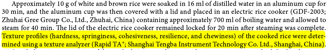 在该研究中,研究人员使用上海腾拔Rapid TA+质构仪测定蒸煮稻米的质构(硬度、弹性、回复性、内聚性和咀嚼性)。相比蒸煮精白米,蒸煮糙米的平均硬度增加33%,平均弹性下降5%,两者之间平均回复性、平均内聚性和平均咀嚼性无显著性差异。蒸煮糙米和精白米质构特性尤其是硬度上的不同受品种的影响。Meixiangzhan 2、Nongxiang 42、Taoyouxiangzhan和Xiangyaiangzhen蒸煮糙米硬度低于Yuzhenxiang蒸煮精白米的硬度。